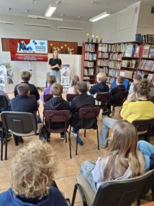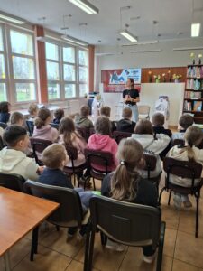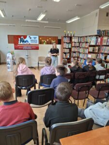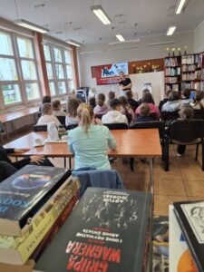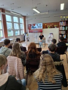 Spotkanie rozpoczęło się od krótkiego wprowadzenia do świata teatru. Uczniowie poznali ciekawostki związane z pracą aktora oraz kulisami przygotowań do spektakli. Pani Magdalena opowiedziała także o swojej drodze zawodowej oraz o najnowszym projekcie – monodramie pt. „Zowdy chciałach być aktorkom”, z którym zdobywa sceny śląskich teatrów.