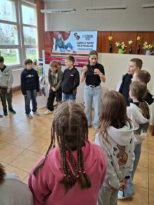 Następnie uczestnicy wzięli udział w teatralnej rozgrzewce, która pozwoliła im poczuć się swobodniej na scenie. Ćwiczenia obejmowały pracę z ciałem, ruchem oraz wyobraźnią. Dużym zainteresowaniem cieszyły się również zadania z zakresu dykcji – uczniowie mieli okazję poćwiczyć poprawną wymowę, tempo mówienia oraz wyrazistość wypowiedzi.
