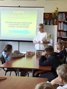 Podczas zajęć dzieci poznały historię katalogów bibliotecznych – od tradycyjnych kartkowych po nowoczesne katalogi elektroniczne. Dowiedziały się, jak wyszukiwać książki w komputerowych bazach danych oraz jak zmieniała się organizacja zbiorów na przestrzeni lat.